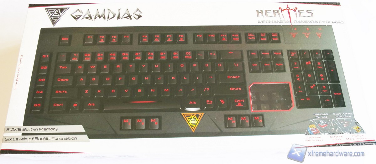 La confezione della GAMDIAS Hermes Ultimate è imponente sia dal piano di informazioni riportate su di essa che per il peso e la grandezza. Nella parte frontale troviamo il logo del brand, il modello della tastiera e un’immagine illustrativa che copre tutta la parte frontale della scatola. Inoltre è presente un’apertura trasparente in corrispondenza delle freccette direzionali abbinate a due tasti macro che vedremo nel corso di questa recensione. Non mancano alcune caratteristiche interessanti di questa tastiera meccanica riportate agli angoli quali una retroilluminazione a sei livelli, una memoria onboard da 512KB oltre a ben 13 tasti Macro programmabili.