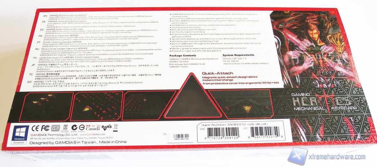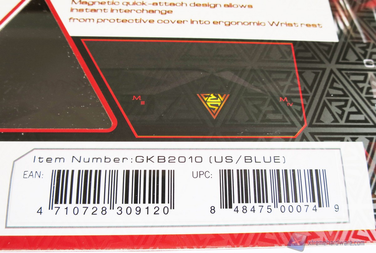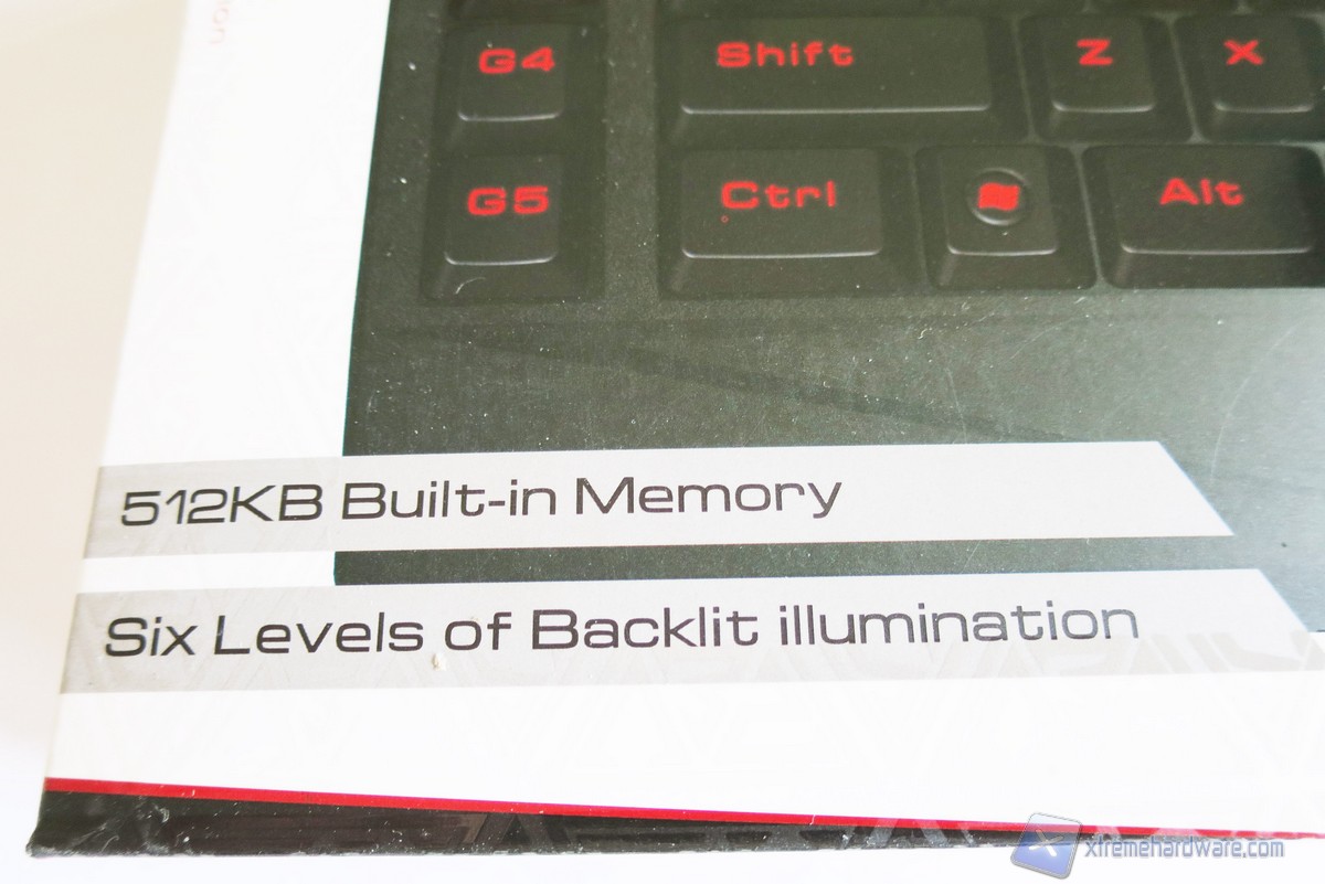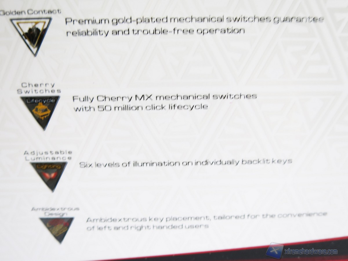 Nel retro della confezione troviamo invece alcune informazioni riportate in varie lingue (tra cui manca l’italiano) oltre ad altre caratteristiche tecniche ed un’immagine illustrativa che completa la grafica. Non manca l’informazione che ci ricorda il tipo di Layout (non e` presente il Layout ITA) e Switch utilizzati. Purtroppo non è al momento disponibile un layout ITA.