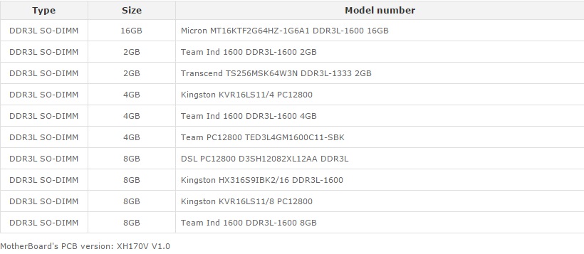 Lo Shuttle XPC Slim XH170V è davvero molto completo sotto il punto di vista delle connessioni disponibili. Come accennavamo la scelta dell’hardware da installare spetta a noi ma Shuttle per garantire la massima compatibilità tra i vari componenti preinstallati da lei stessa, quali Mainboard, alimentatore e dissipatore, ha stilato alcune tabelle guida in modo da assicurarci una compatibilità al 100% con l’XH170V. Di seguito trovate la lista completa delle memorie supportate: